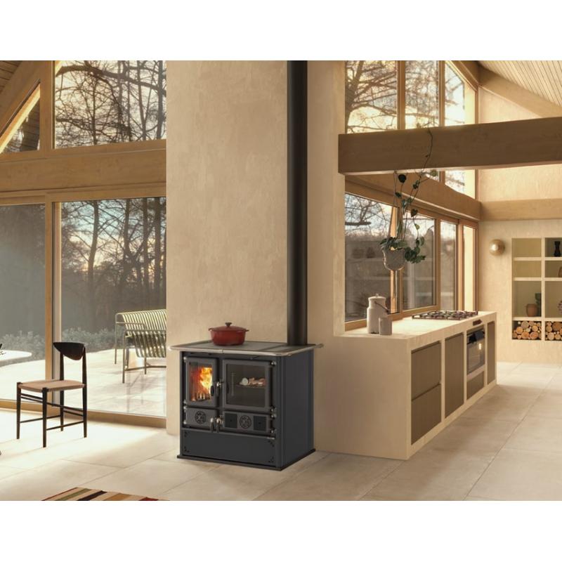 La cuisinière à bois Rosa Steel 5.0 de la marque La Nordica est un appareil qui vous permettra de chauffer votre logement jusqu’à 252 m3 mais aussi de cuisiner vos plats puisqu’il possède un four intégré d’une capacité de 41 litres.