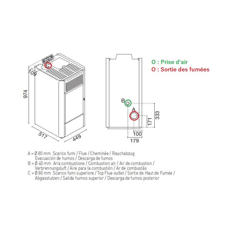 Schéma technique du Poêle à granules étanche – EVA CALOR Nora 6.5 kW