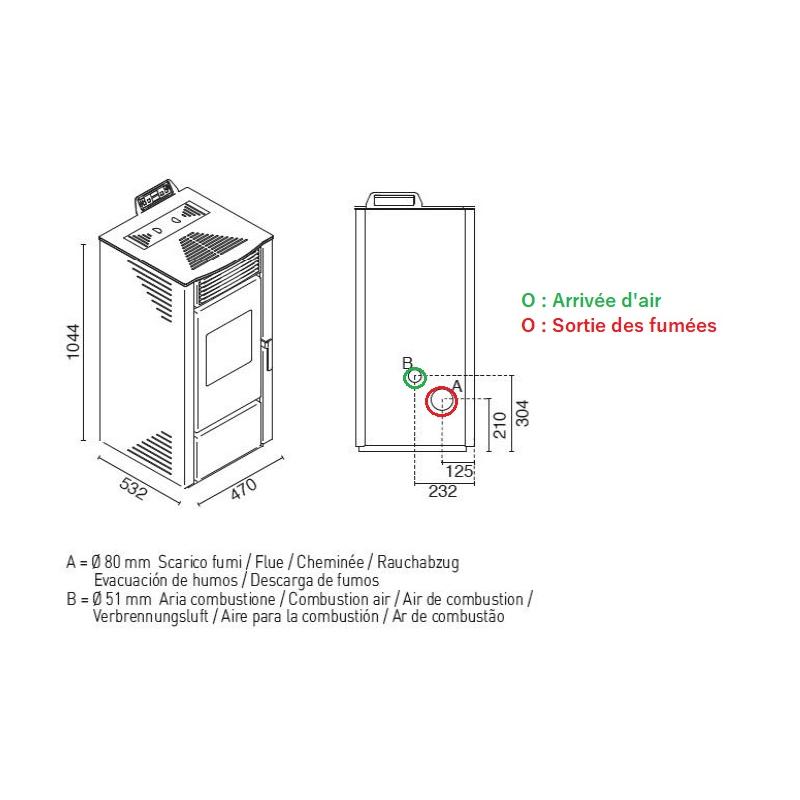 Schéma technique du Poêle à granules ventilé – EVA CALOR Paola 12.5 kW
